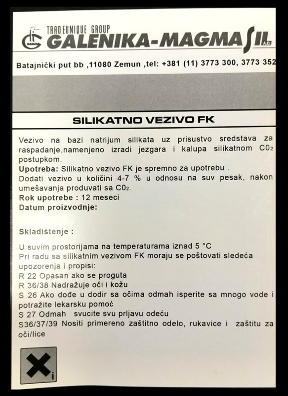 Silikatno vezivo („sigel”) FK je vezivo na bazi vodenog stakla koje sadrži sredstvo za raspadanje (2-20%). Namenjeno izradi jezgara i kalupa silikatnim CO2 postupkom.